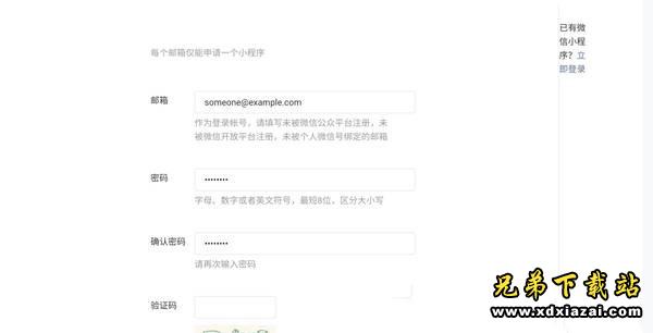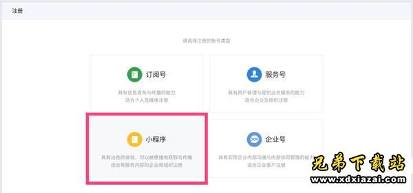 兄弟下载站的小编与大家分享一下注册微信小程序的流程: 打开微信公众平台 https://mp.weixin.qq.com/ ,在右上角点击“立即注册”。接着进入注册账号类型的选择页面,可以看到,除了常规的订阅号、服务号与企业号之外,还出现了“小程序”的选项。